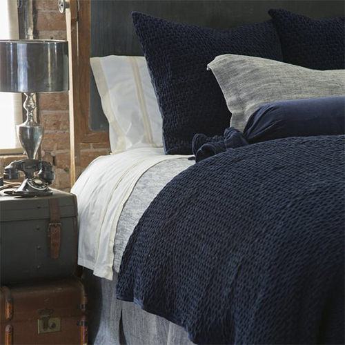 The combination of finishes in this collection exemplifies the natural beauty of our expertly crafted bedding. The decadent cotton percale with ivory linen bands polish the natural depth of the . Jerome linen duvet covers and perfectly tailored bed skirt. Accompanied by the Indigo Blue Emesto Quilt and Shams, this collection is further embellished by an exceptional cotton velvet round bolster with elongated ties.
